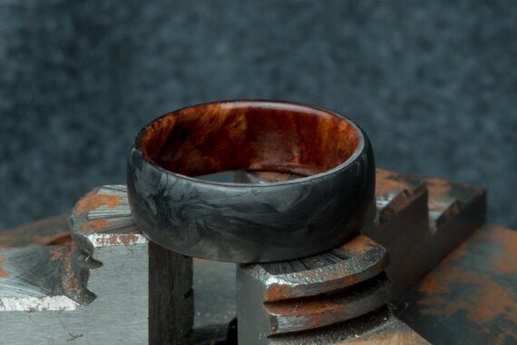 Background. The ultimate carbon fiber wedding ring. Composition carbon fiber and walnut wood wedding band.